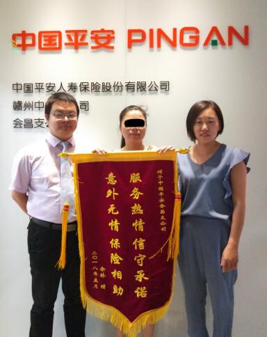 江西企业网讯 近期,赣州市会昌县客户家属刘女士将一面“服务热情信守承诺,意外无情保险相助”的鲜红锦旗送到平安人寿江西分公司以感谢公司专业的暖心赔付。